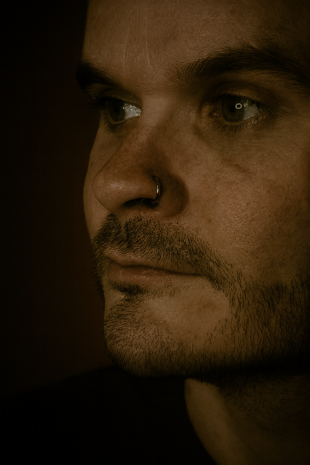 Close-up side profile of a man with beard stubble and a black circular nose ring, in warm moody lighting, highlighting facial features and piercing detail."