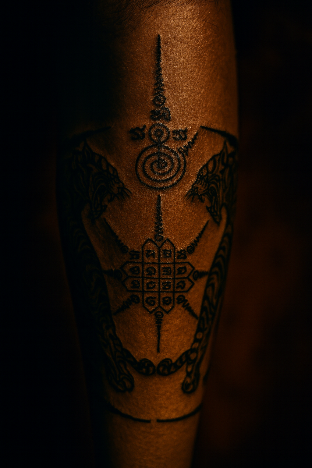"Close-up of Yant Suea Koo (Twin Tiger) Sak Yant tattoo in black ink with Ancient Khom script, sacred geometry, and detailed twin tiger design symbolizing strength, power, and protection, lit in warm golden tones."